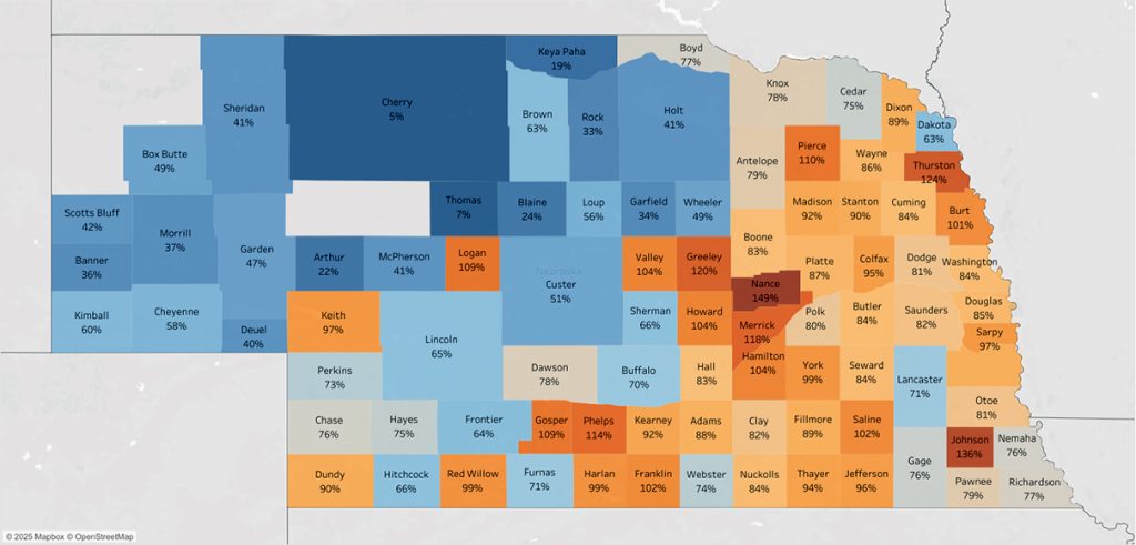 According to the 2022 Census of Agriculture, Nebraska boasts 21 million acres of cropland. However, 2024 farm bill enrollment data shows that the state has 15.89 million acres of base. In other words, approximately 75% of Nebraska’s cropland is supported by farm bill program payments.