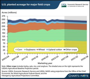 “Overall, the outlook points to a stable-to-softening acreage base dominated by corn and soybeans, with incremental reductions from recent highs as profitability pressures persist,” according to the chart drawn from the USDA Agricultural Projections to 2035, released in February 2026.