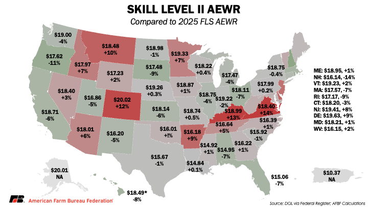 Skill Level II jobs require prior experience, certifications or technical knowledge that allow them to work with less supervision, such as workers responsible for the first pick of an apple orchard determining if fruit is ripe. These wages will be a combined field and livestock worker wage of the average hourly wages of the “big five” SOC codes statewide. When examining just the new AEWR for Skill Level II employees, an OEWS combined field and livestock worker wage would increase wages for Skill Level II jobs in 26 states.