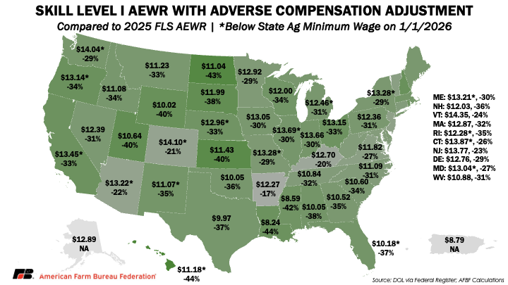 Employers may only deduct this adverse compensation adjustment from H-2A worker wages, not corresponding domestic workers, even if domestic workers live in employer-provided housing. All considered, domestic workers will receive the state minimum wage instead of the AEWR by Jan. 1, 2026, in eight states (California, Connecticut, Florida, Hawaii, Maine, Maryland, Rhode Island and Washington), and in two additional states, Oregon and New York, where it will apply only in more urban areas.