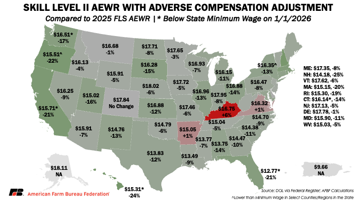 The adverse compensation adjustment would push the AEWR below the state minimum wage for eight states: Arizona, Colorado, Illinois, Maine, Maryland, Michigan, Nebraska and New Mexico. This puts domestic and H-2A workers back at the same wage, despite the compensation disparities DOL says exists between the groups. Even at the higher Skill Level II wages, seven states have AEWRs below the state minimum wage with the compensation adjustment (California, Connecticut, Florida, Hawaii, New York, Oregon and Washington), eradicating the efforts to allow higher compensation for higher skilled employees and level the payroll costs, and living expenses, of H-2A and domestic workers.