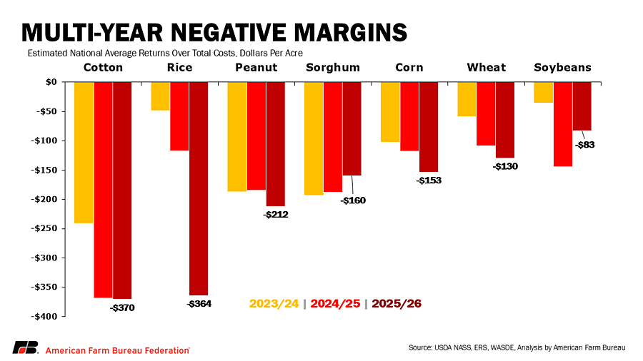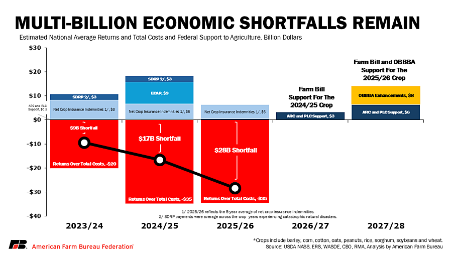 Even after including this ad hoc support along with support from crop insurance, returns above total costs are estimated to remain negative from the 2023/24 through 2025/26 crop years at -$9 billion, -$17 billion and -$28 billion, respectively. The farm bill and OBBBA enhancements to the farm bill will come in fiscal years 2026 and 2027, but until that support arrives, farmers across the U.S. are left with accumulated losses that are currently estimated in excess of $50 billion over the last three crop years.