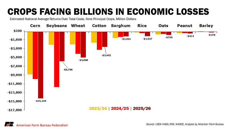 The math is the same for every major crop — as well as specialty crops — and it’s been that way for several consecutive years, with combined annual returns below total costs (for nine principal crops) from the 2023/24 to 2025/26 crop years at -$20.2 billion, -$34.8 billion and -$34.6 billion, respectively, and before crop insurance indemnities and other support.*