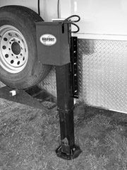 Electric jacks are cheaper, hydraulic jacks are faster and made for heavy use. You can use 12 volts from your truck or onboard battery on the trailer. We installed a battery on my trailer so we could demonstrate the jack. It’s nice having a battery on the trailer; you can have lights any time you need to see in the tack room. You can get a manual override on the hydraulic jack as an option, which could come in handy if you have a run-down battery.