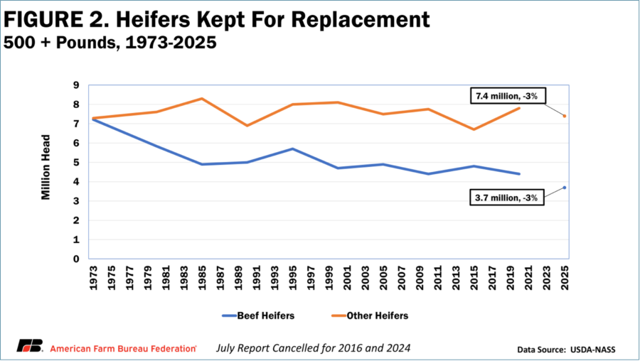 USDA revived the July cattle report after cancelling it in 2024. This report is one of two reports that provides detailed estimates of the inventory of all cattle and calves in the United States. When combined with USDA’s monthly Cattle on Feed report, there is evidence of continued contraction in the U.S. beef herd. If female cattle from this year’s calf crop are kept this fall, they would be capable of producing their first calf in 2027. This would provide an opportunity for the first meaningful growth in the U.S. cattle herd in 14 years and signal the start of a new cattle cycle.