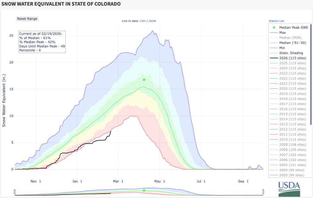 “We still have about a month and a half to go before the peak date of statewide snowpack in early April. While that still gives us a window for snow to accumulate, we need significant precipitation between now and then to help reduce our current deficits,” Mazurek said. She noted that NOAA’s climate outlook for March and seasonal outlook (both released Feb. 19) suggest Colorado has increased odds for below-normal precipitation over both of these forecast periods.