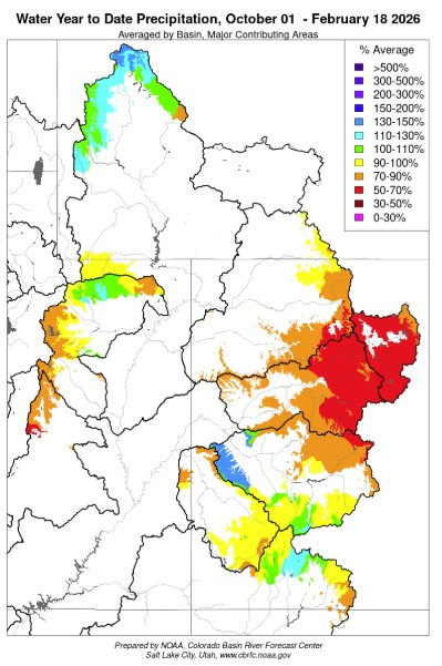 The mid-February snowfall only resulted in a percentage point or two, Miller said. The Upper Colorado Basin has minimally benefited. The Lower Colorado River Basin has been more beneficial.