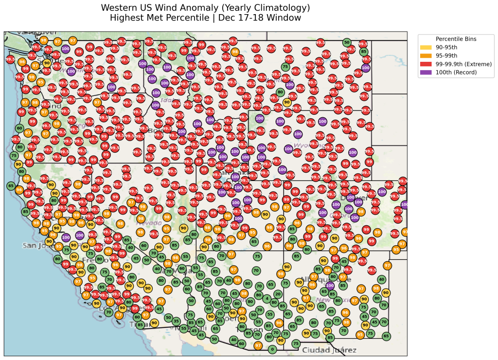 A powerful widespread zone of fierce winds that whipped through the northern Rocky Mountain states and the Northern Plains the week of Dec. 14-19, is being classified as a record-strong wind event. The massive wind scale delivered new record-strong wind gusts throughout the Intermountain West, from Colorado, Wyoming, Montana, Utah, Idaho, Washington state, central California and central New Mexico, also in the Dakotas in mid-December.