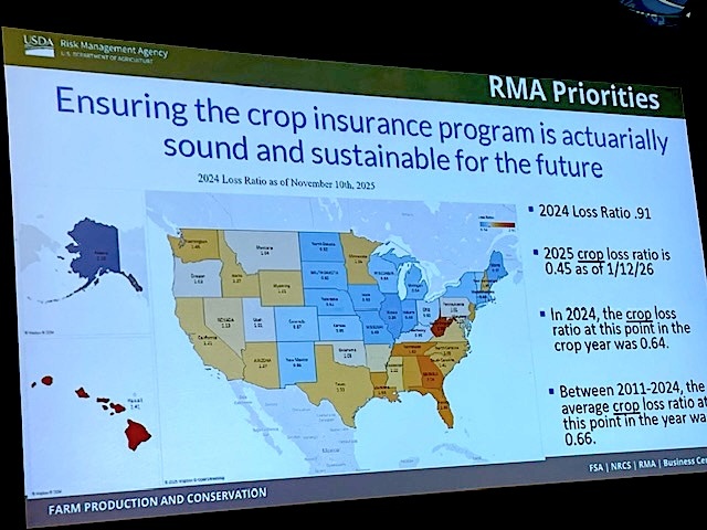The nationwide loss ratio for crop year 2025 as of Jan. 12 is 0.45, which means that more premiums were paid for policies than indemnities paid for losses incurred, Swanson said. That’s better than 2024 when the loss ratio for the year was 0.91.