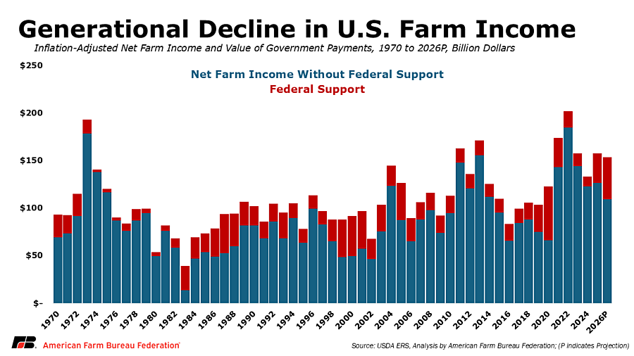 This timing shift helps explain why net cash farm income is forecast to rise in 2026 even as cash receipts from commodity sales decline, reinforcing that recent income stability continues to be supported by government assistance rather than stronger market conditions.