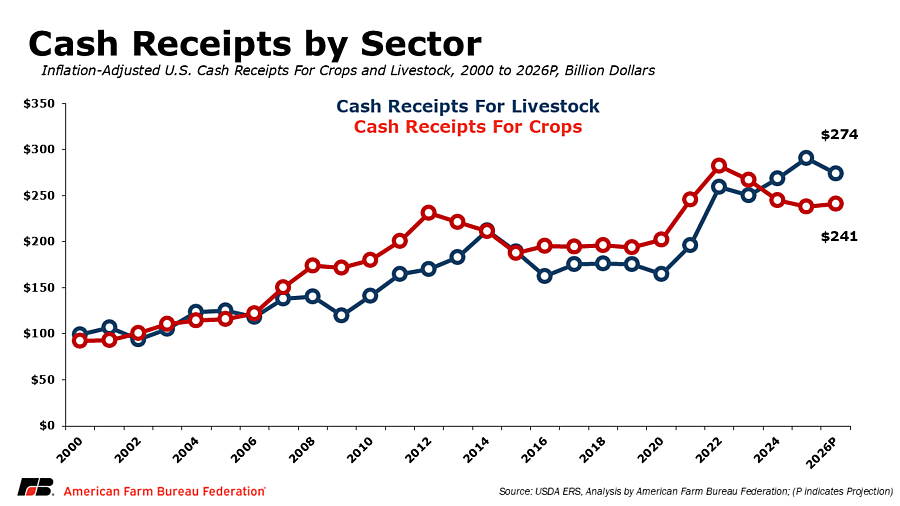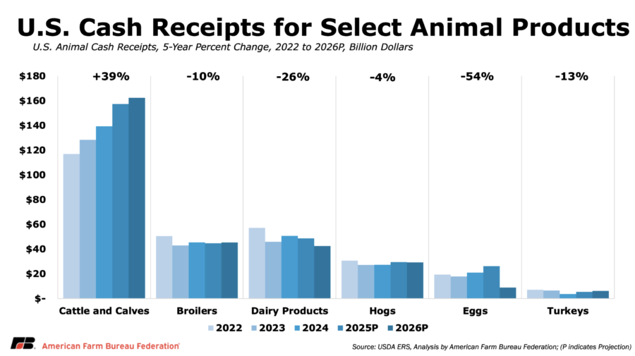 In contrast, cattle and calf receipts are forecast to continue increasing in 2026, rising $5.2 billion (4.1%) as tight supplies support higher prices. Broiler receipts are projected to increase modestly, up $0.6 billion (1.4%), reflecting steady demand and production.