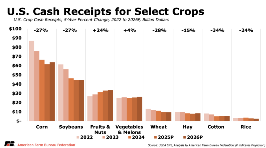 Among specialty crops, vegetable and melon receipts are projected to increase $0.7 billion (2.7%) in 2026, supported by higher prices, while fruit and nut receipts are forecast to rise a combined $0.4 billion (1.2%). While these gains provide some support, they are not large enough to offset ongoing weakness across major field crops.