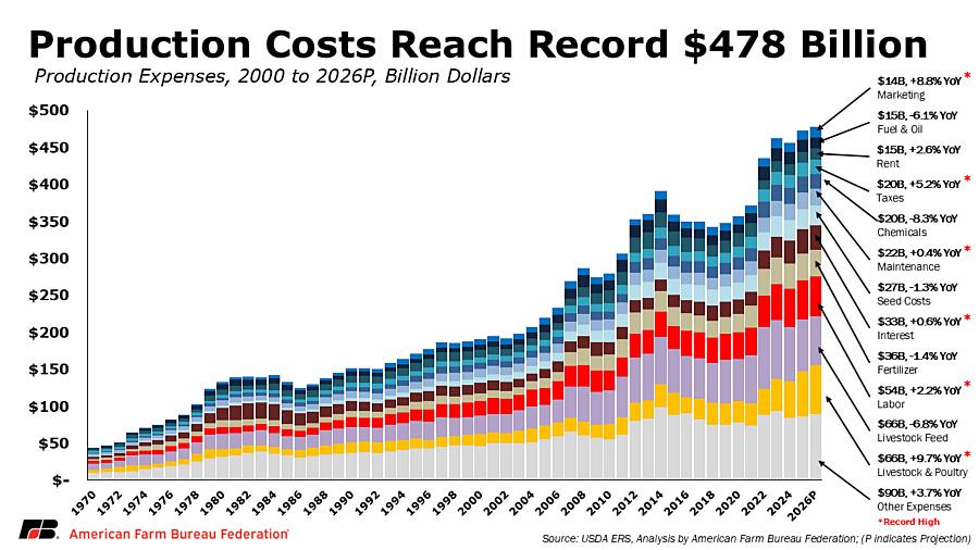 USDA forecasts total farm production expenses, including those associated with operator dwellings, will total $477.7 billion in 2026, an increase of $4.6 billion (1%) from the revised $473.1 billion estimate for 2025. After adjusting for inflation, however, total expenses are projected to decline by 0.9%, reflecting modest easing in some input costs rather than a broad reduction in cost pressure.