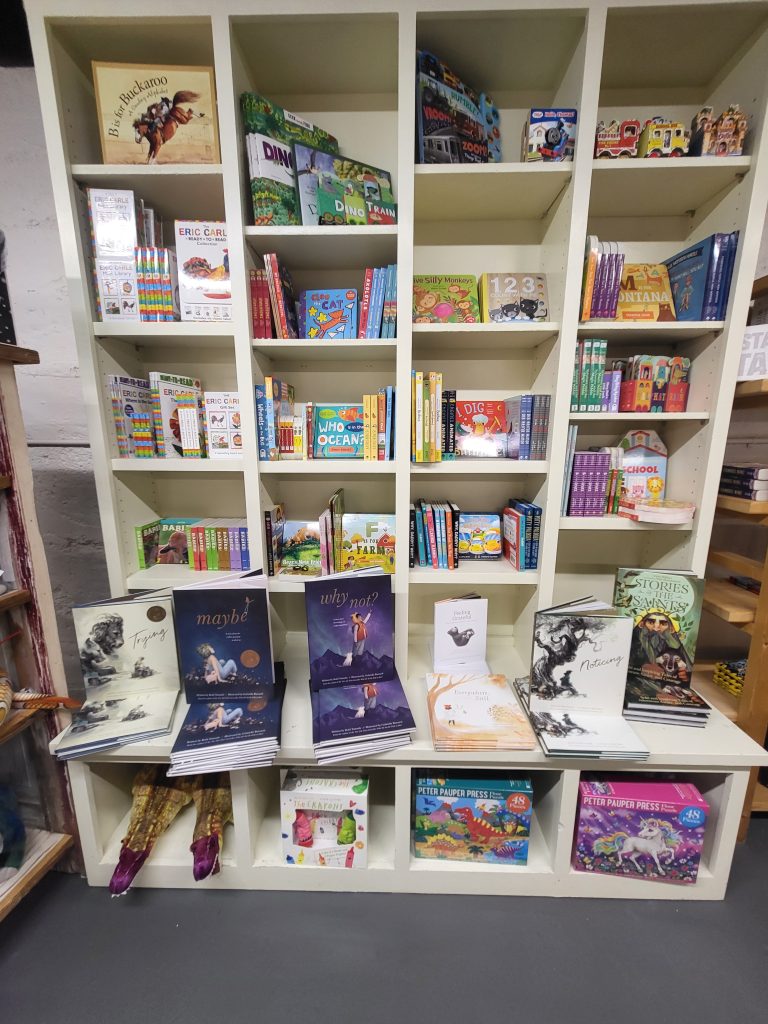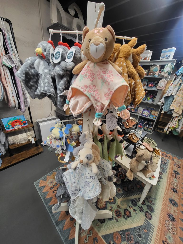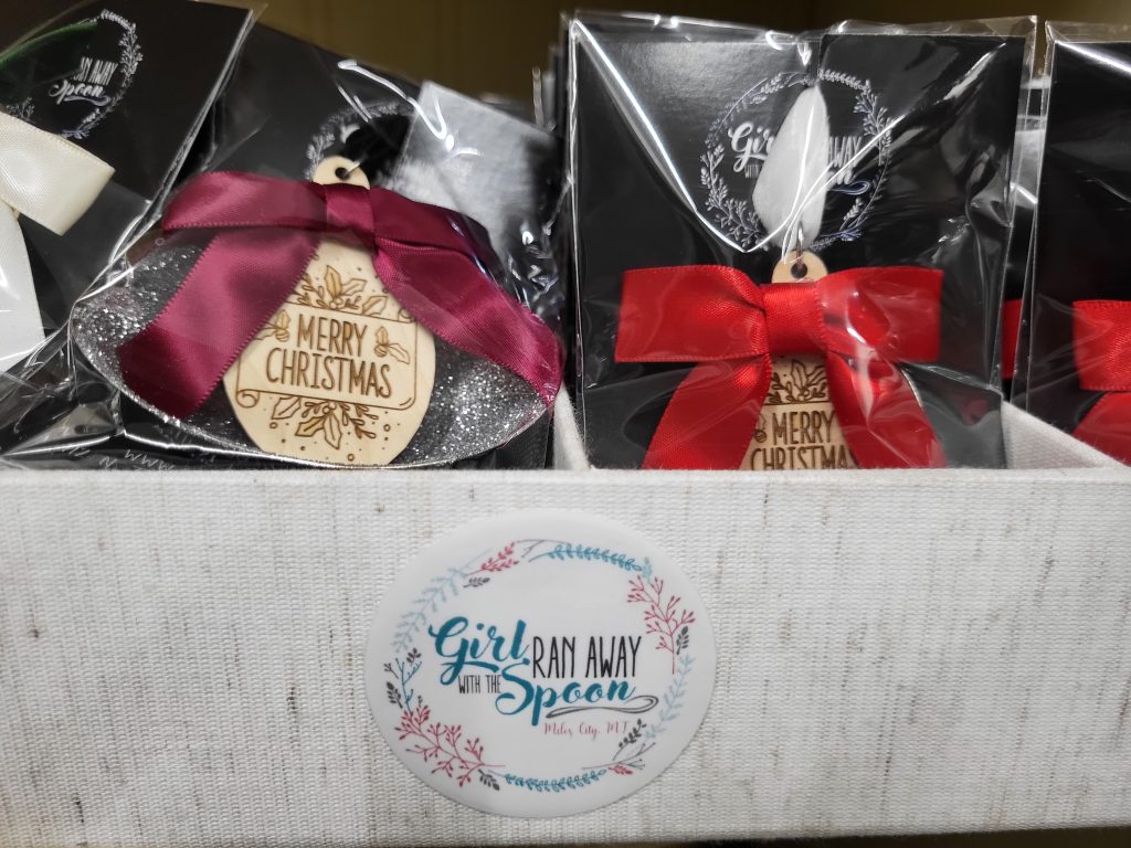 Blaquiere gave a verbal walkthrough of their store – the Montana gift section; Erin’s metal sculptures; pampering goods; candles and diffusers; the jewelry bar featuring charms and spoon items to create individualized jewelry; holiday décor; journals and Christian books; kitchen goods and mixes; and a new-to-you clothing section. In addition to the spoon jewelry, the section that has the biggest draw is the basement treasure trove of children’s and baby gifts. “This is one of our biggest draws, as we are one of the few stores in town that offer baby and children’s gifts.” Additionally, Blaquiere herself specializes in laser engraved items and services. She can take “Grandma’s handwritten cookie recipe” and etch it on a wooden cutting board, in addition to custom jewelry and other personalized gift items.