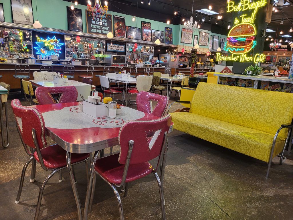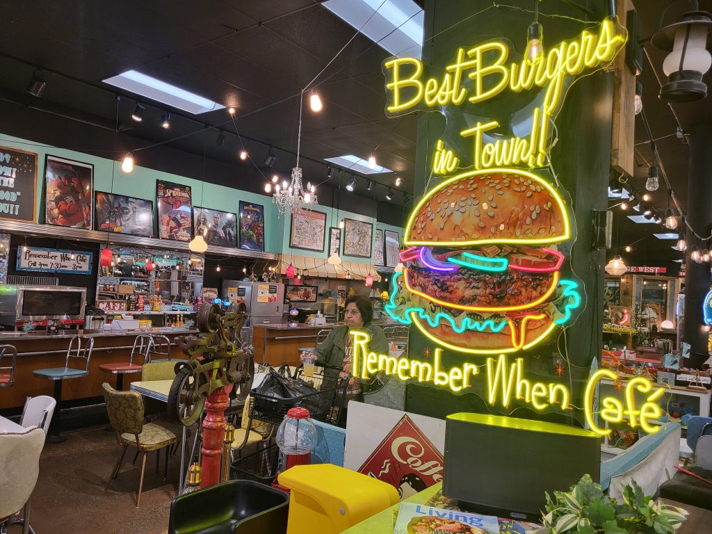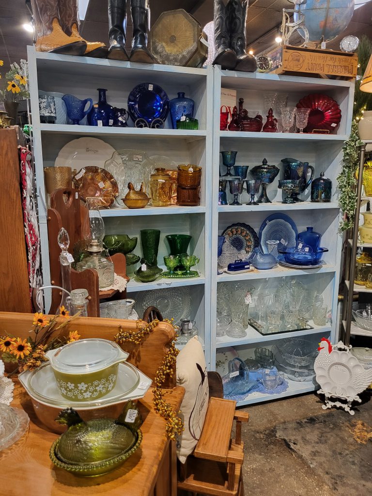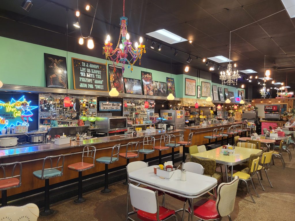 How does one describe Vintage & Rustics? They started off strictly as an antique vendor mall, said Leesburg. They quickly filled the empty storefront that was formerly the Ben Franklin, and before that a Woolworth’s. The crowning jewel of the store is the vintage cafeteria complete with original bar seating and retro tables and chairs. Named the “Remember When Café,” they offer breakfast and lunch. Their bakery is filled with glass globes of delectable, hand-baked delicacies, alongside full coffee bar. Over the years they twice purchased and expanded into adjacent storefronts, remodeling to reveal historic treasures like penny tile flooring, and adding niche offerings as they went.